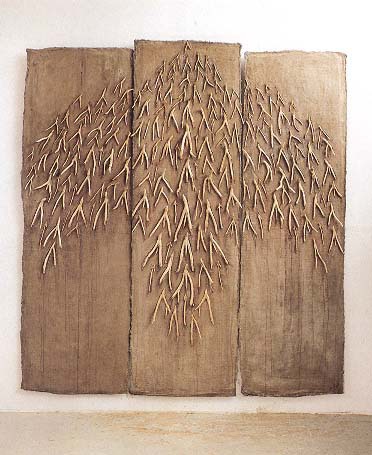 Er verwendet Fundstücke wie Steine, Holz, Zweige, Jute und Stoff, die er mit Leim und Farbpigmenten verbindet. Die Skulpturen erinnern an archaische Überreste einer versunkenen Welt. Er bedient sich in seinen Arbeiten sowohl christlicher Religion als auch mythologischer Themen. Gemeinsam ist allen Arbeiten, die abstrakt und doch konkret wirken: Sie sind abgeleitet von Lebewesen - Menschen, Tieren, Pflanzen - manchmal Abbilder der äußeren Gestalt, häufig Inneres nach außen sichtbar gemacht. Meist sind es Fundstücke, deren vorgegebene Form er verwendet, um neue Bedeutungen zu schaffen. Größere Äste werden zu Tieren mit filigran hervorstehenden Rippen, kleinere Astgabeln, ausgerichtet gen Norden sind Zeichen für den Nordflug der Zugvögel.