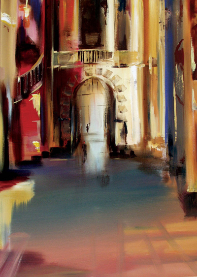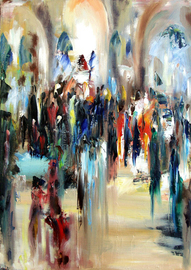 Nah-Aufnahme – aus der Ferne. Robert Hettich, 1964, deutsch-russischer Herkunft, ist in Taboschar im Hochgebirgsland Tadschikistan geboren. Dort hat er seine erste Ausbildung zum Künstler erfahren. Seit 1988 in der Bundesrepublik Deutschland, ist er nach einem Zweitstudium Kunst und Design in Hannover als Künstler und Designer freiberuflich tätig. Seine Bilder halten vor allem Stimmungen einer Malerseele des Ostens, Reaktionen auf Monumente und Menschen fest. Die Stadt, Flaneure, Publikumsverkehr in neugotisch anmutenden Hallen ist sein Hauptthema. Schemenhaft bewegen sich Menschen, zur Farbsilhouette verdichtet, auf Straßen, in Räumen. Überstreckt die Personen, nie mit erkennbaren Gesichtszügen, sind sie Impression von Farben und Strich. Meist deambulieren sie in monumentalen Räumen, gehen Alltagsgeschäfte oder geselligem Tun nach. Entdeckungsfreude des Künstlers auf Menschen in der Stadt, Neugier und Nah-Sicht bestimmen seine Farbkompositionen.
